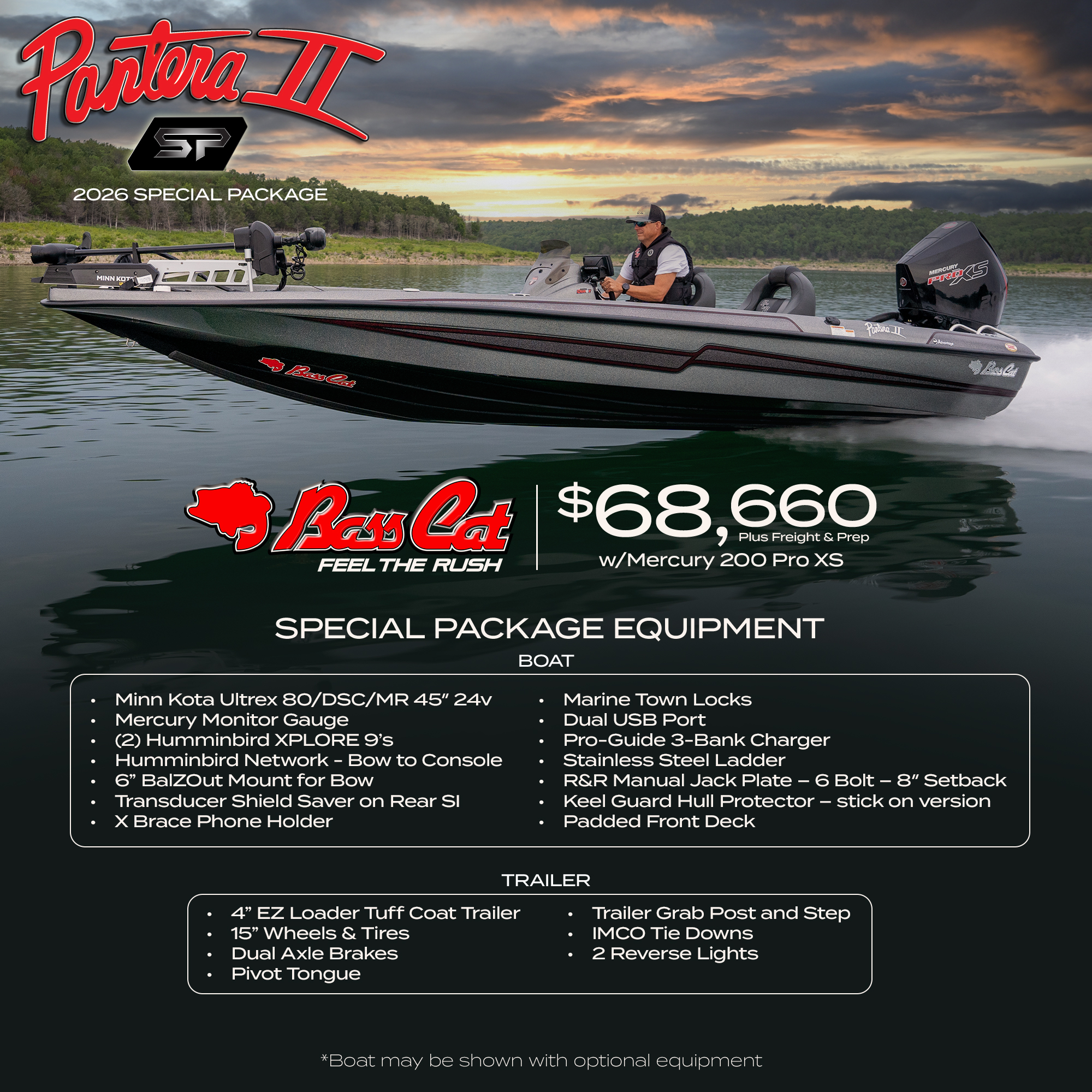 One of the most popular bass boat models ever built, enjoy value-packed savings in this ready-to-fish Special Package for 2026. The Pantera II, outfitted with a Mercury 200 Pro XS, is a proven tournament performer, loaded with the latest accessories in a turn-key package. Time to lock in your dream at a Bass Cat dealer near you!